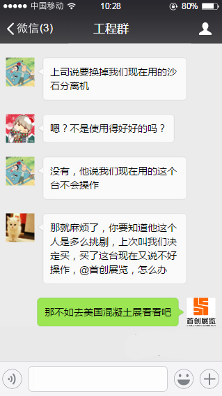 C:那就麻煩了,你要知道他這個(gè)人是多么挑剔,上次叫我們決定買,買了這臺(tái)現(xiàn)在又說(shuō)不好操作。@首創(chuàng)展覽,怎么辦